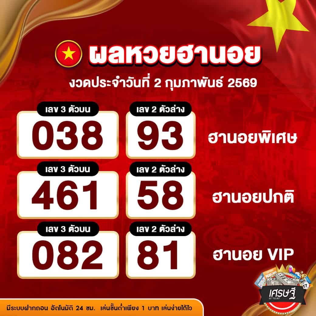 ผลหวยฮานอยงวดล่าสุด ประจำวันที่ 2 กุมภาพันธ์ 2569 ผลการออกรางวัลที่สำคัญ มีดังนี้