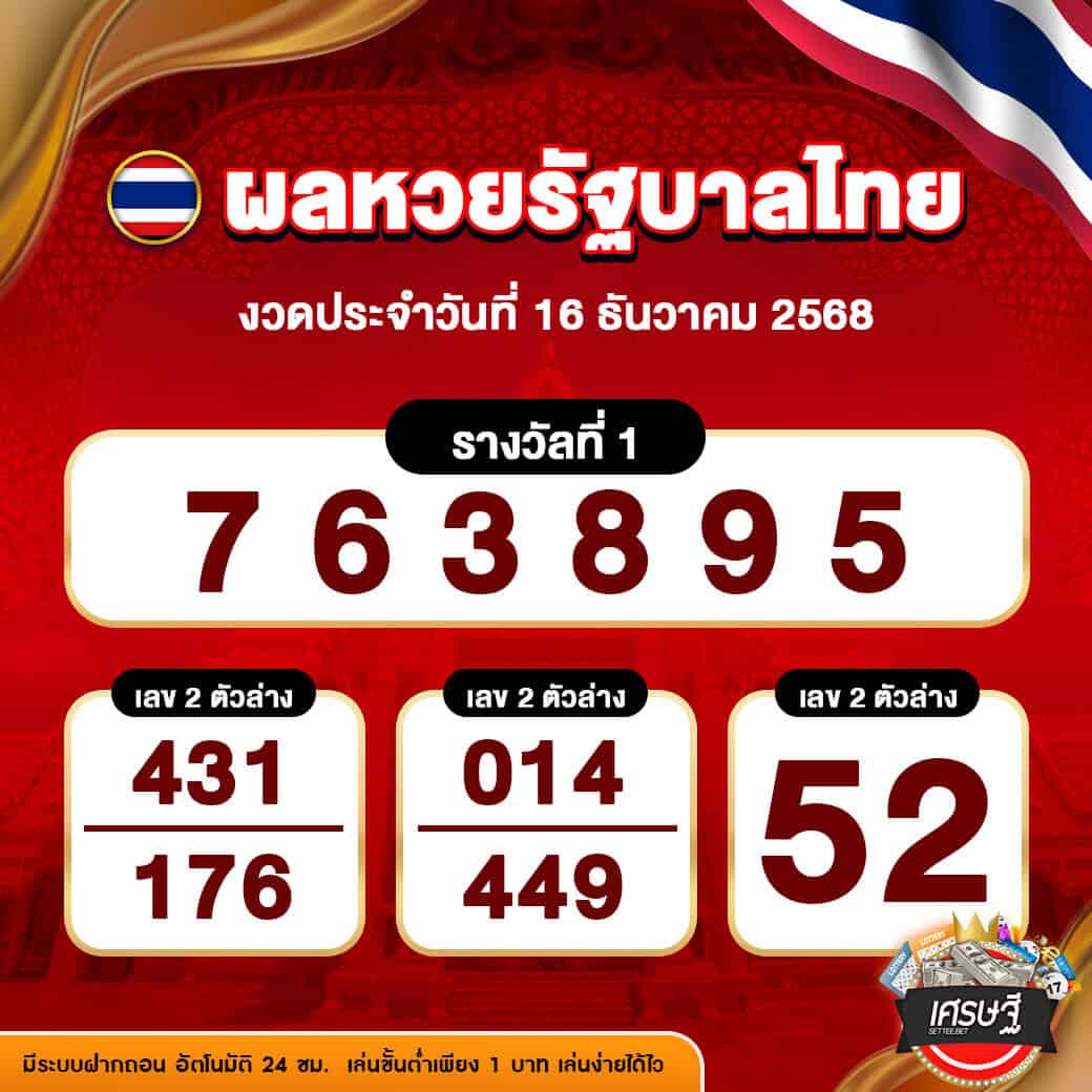 ผลหวยรัฐบาลไทย งวดวันที่ 16 ธันวาคม 2568