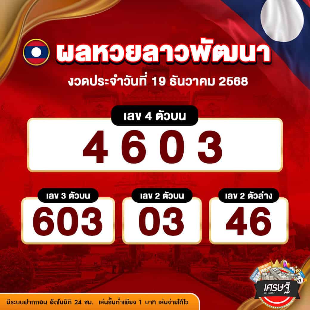 ผลหวยลาวพัฒนางวดล่าสุด ประจำวันที่ 19 ธันวาคม 2568 ผลการออกรางวัลที่สำคัญ มีดังนี้