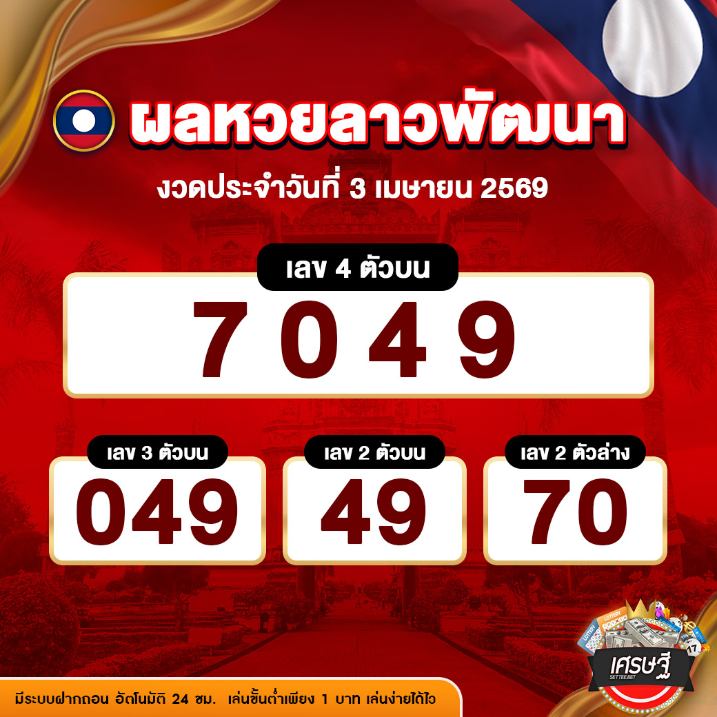 ผลหวยลาวพัฒนางวดล่าสุด ประจำวันที่ 3 เมษายน 2569 ผลการออกรางวัลที่สำคัญ มีดังนี้