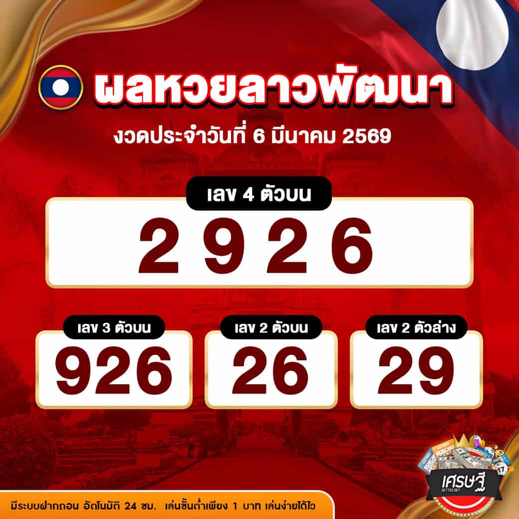 ผลหวยลาวพัฒนางวดล่าสุด ประจำวันที่ 6 มีนาคม 2569 ผลการออกรางวัลที่สำคัญ มีดังนี้