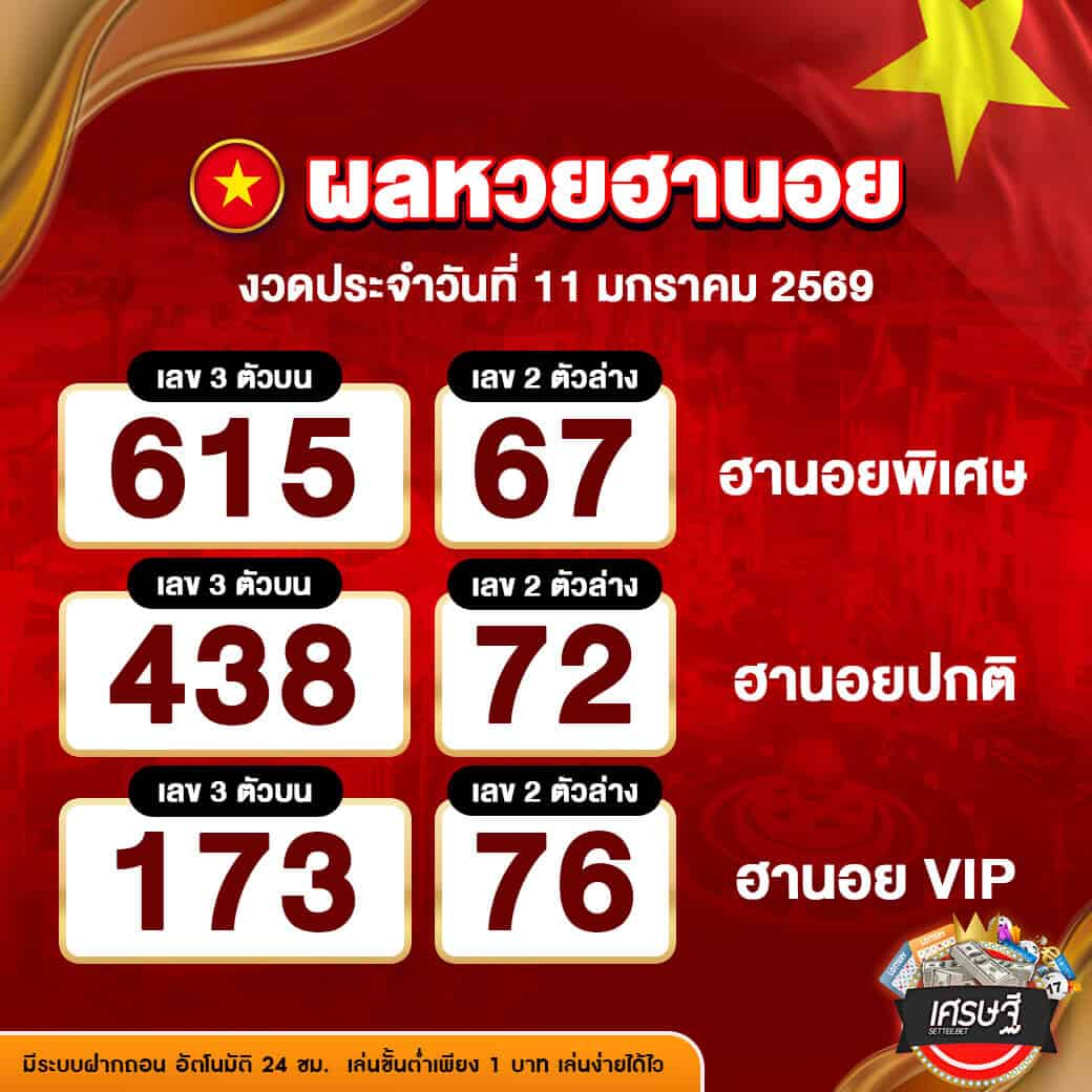 ผลหวยฮานอยงวดล่าสุด ประจำวันที่ 11 มกราคม 2569 ผลการออกรางวัลที่สำคัญ มีดังนี้