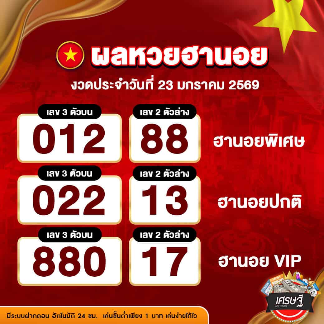 ผลหวยฮานอยงวดล่าสุด ประจำวันที่ 23 มกราคม 2569 ผลการออกรางวัลที่สำคัญ มีดังนี้